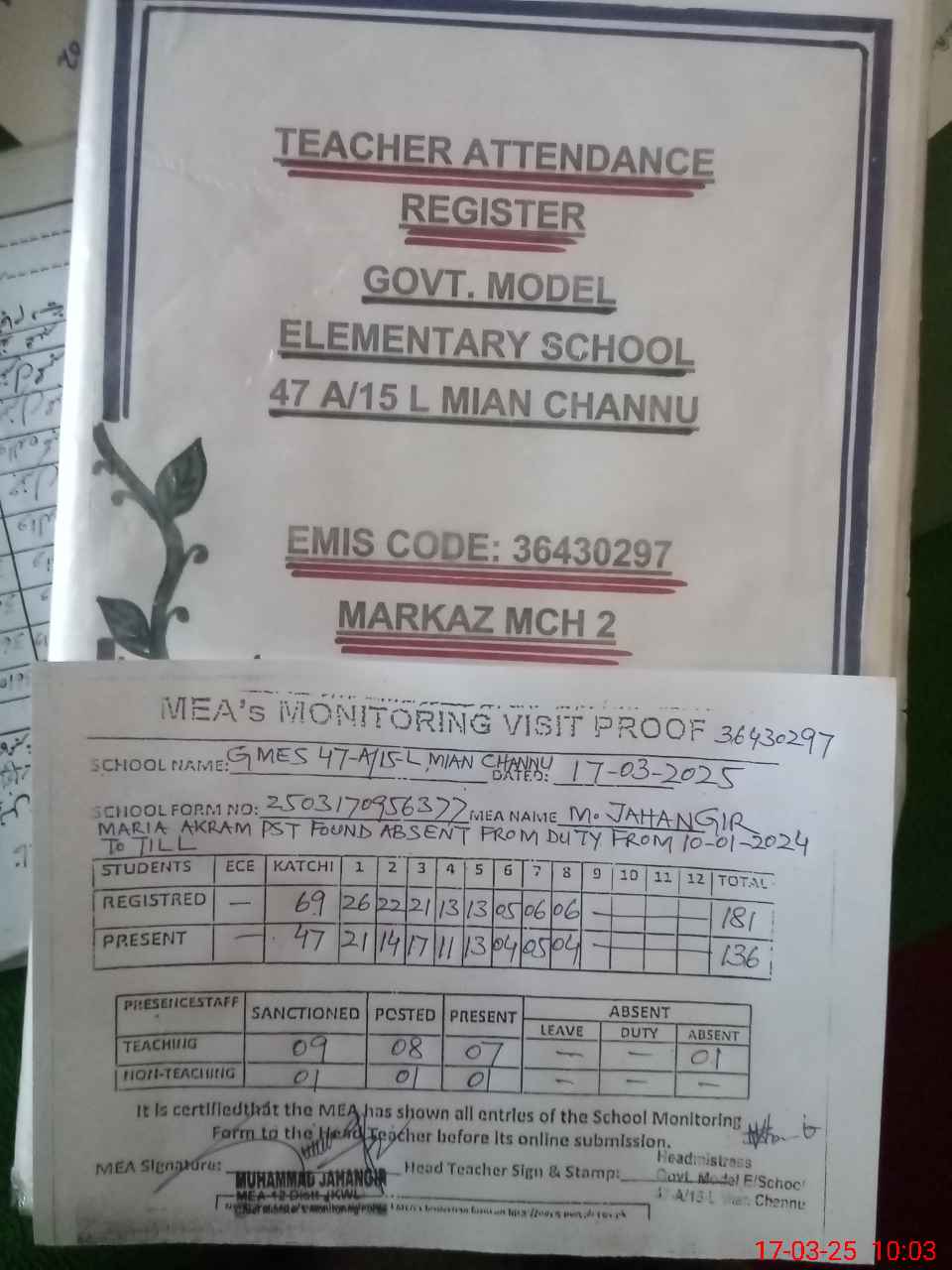 | EMIS Code: 36430297 | Name of School: GMES 47-A/15-L, MIAN CHANNU | |||