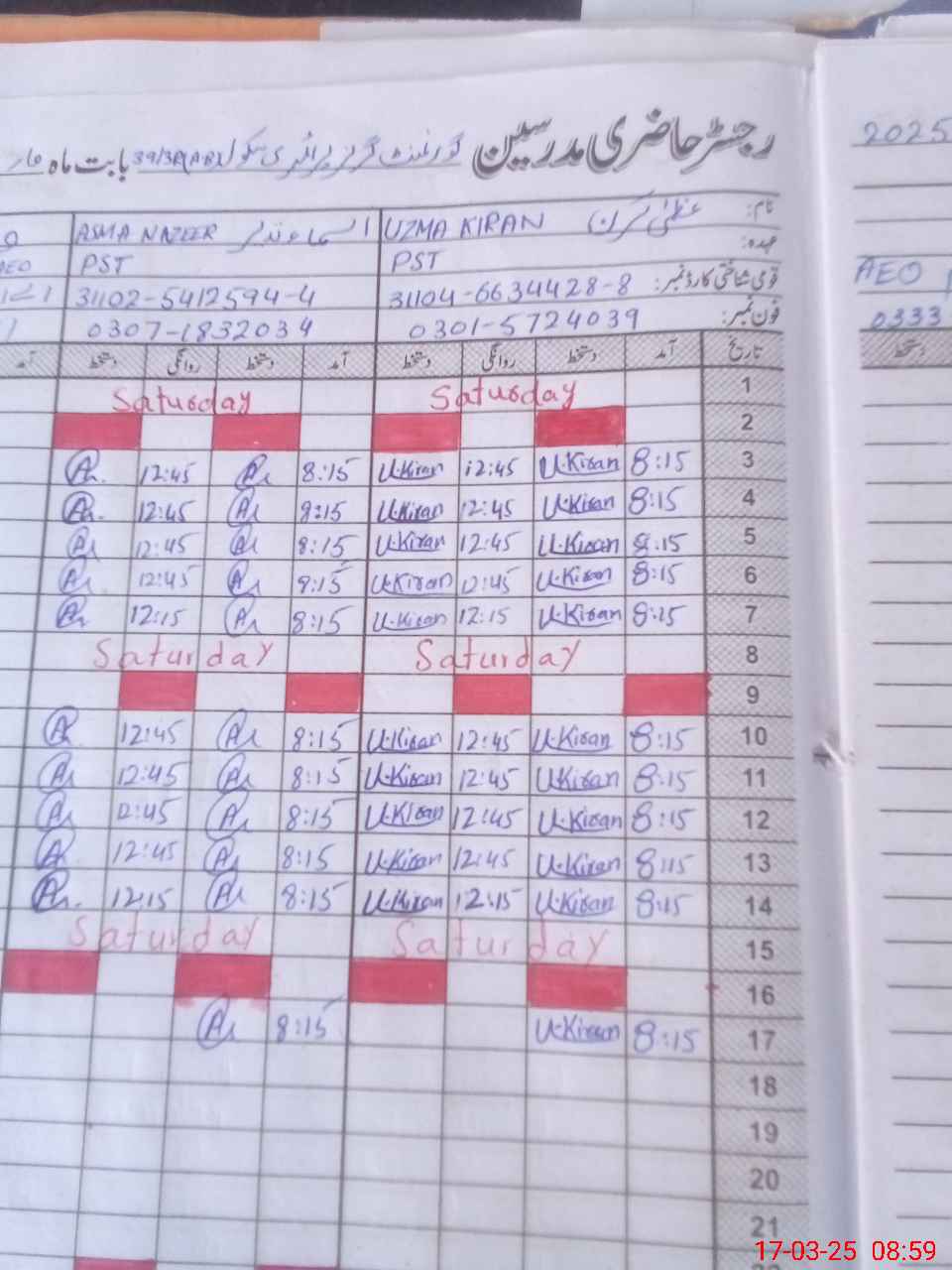 | Name: Uz**** Ki**** Designation: (School Headmaster's/Headmistress's) PST Phone/Cell Number: 03**** |
