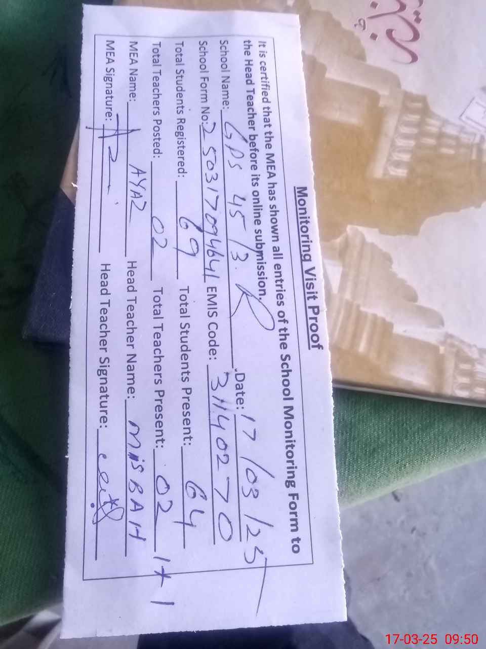 | Attendance Register | Head Teacher | MEA with School | Visit Proof |