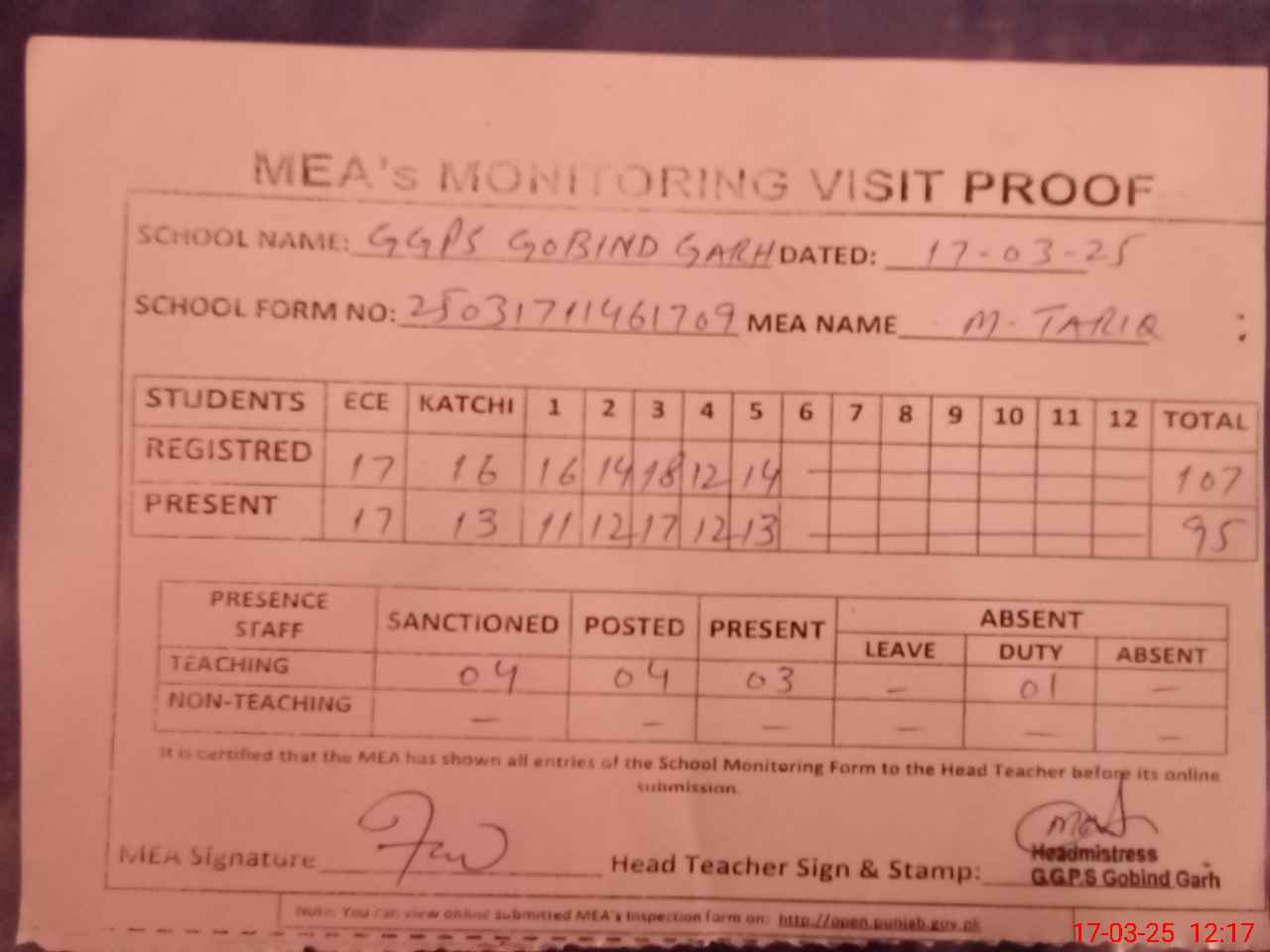 | Attendance Register | Head Teacher | MEA with School | Visit Proof |