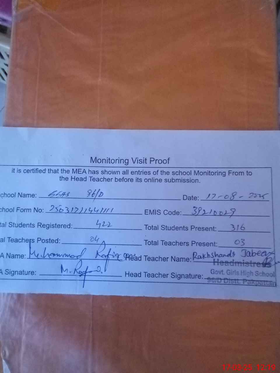 | EMIS Code: 39210029 | Name of School: GGHS CHAK NO. 96 D | |||