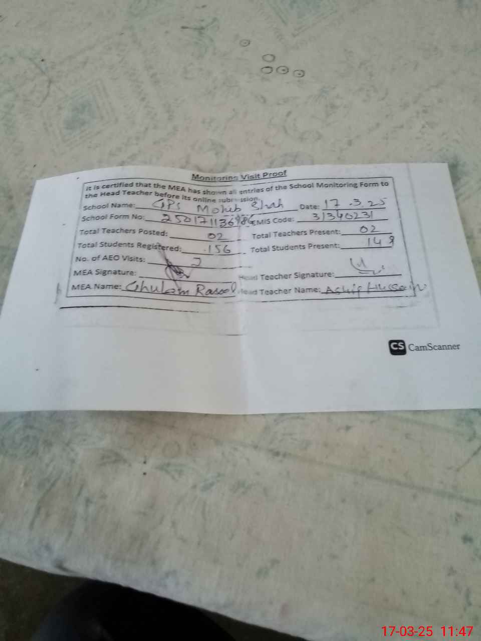 | Attendance Register | Head Teacher | MEA with School | Visit Proof |