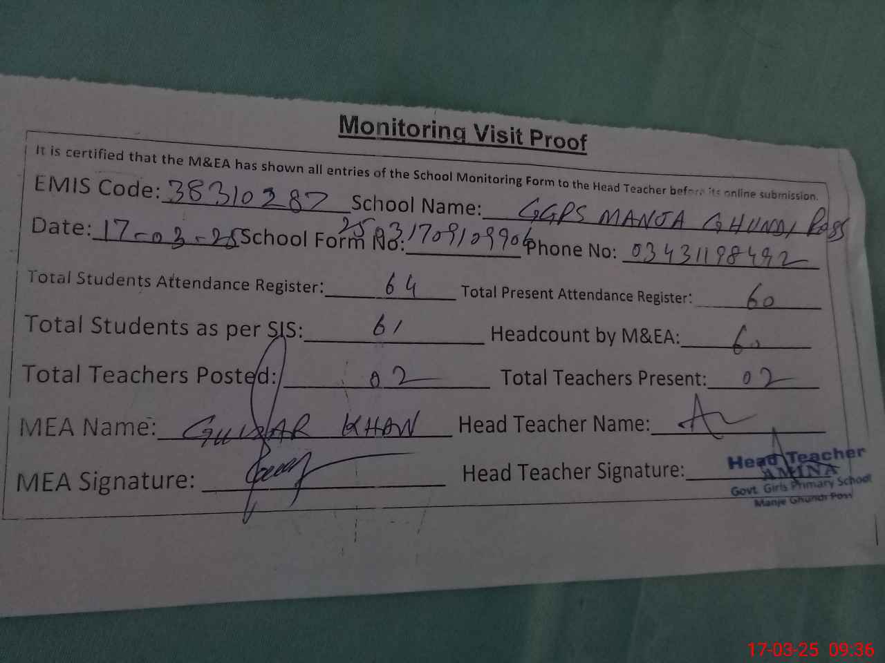 | EMIS Code: 38310287 | Name of School: GGPS MANJA GHUNDI POSS | |||