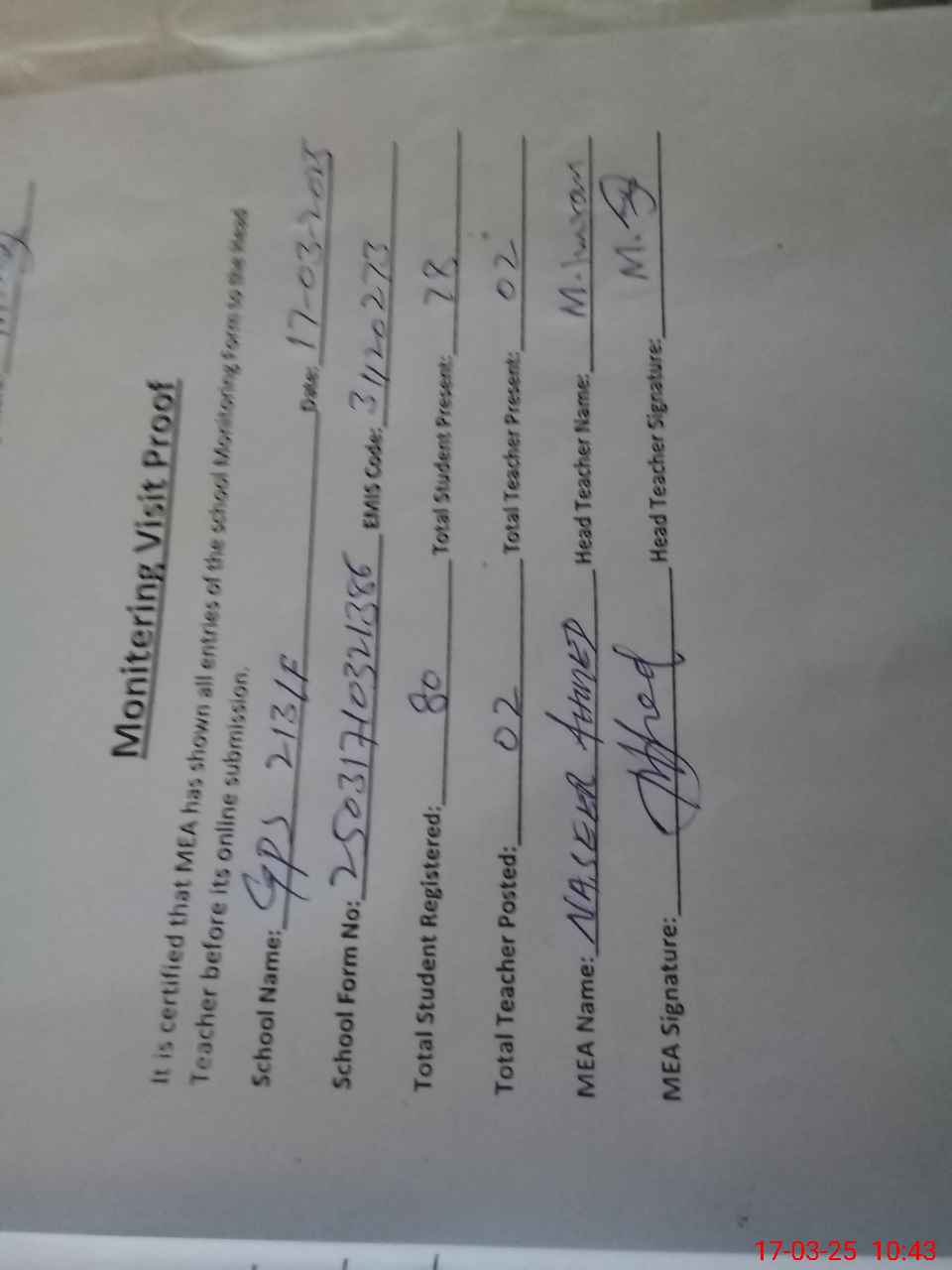 | EMIS Code: 31120273 | Name of School: GPS CHAK NO 213/F | |||