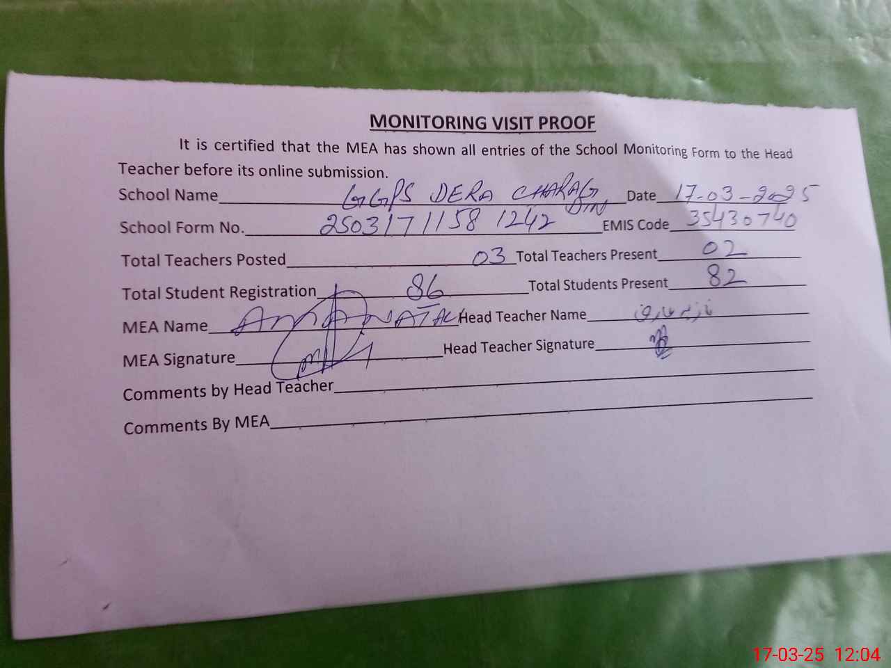 | EMIS Code: 35430740 | Name of School: GGPS DERA CHARAGHDIN | |||