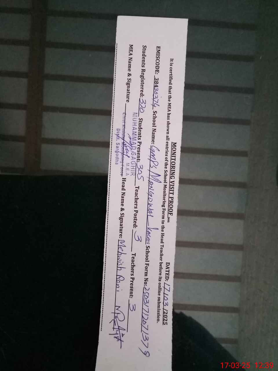 | Attendance Register | Head Teacher | MEA with School | Visit Proof |