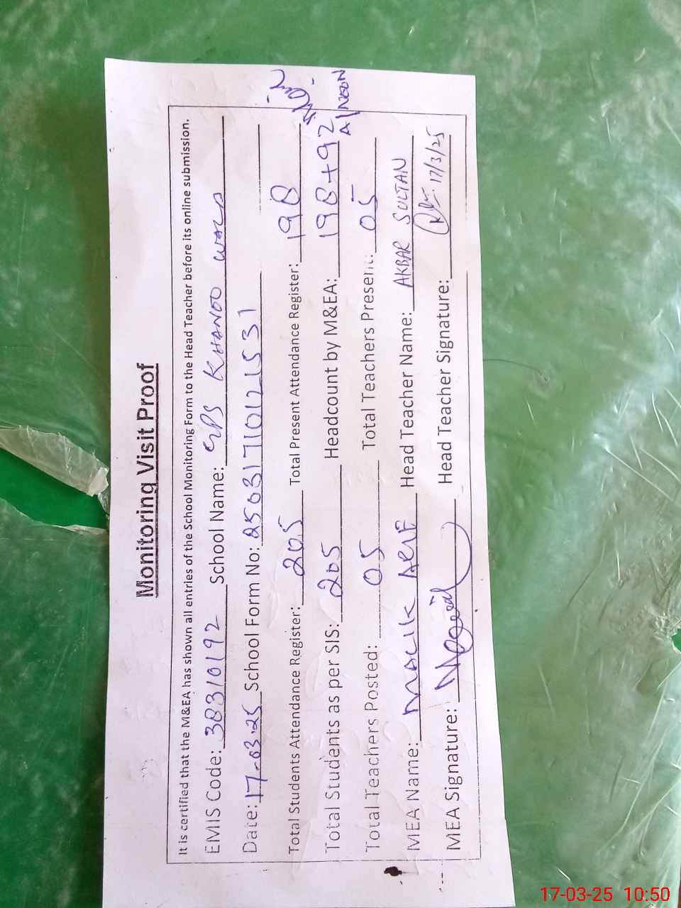 | Attendance Register | Head Teacher | MEA with School | Visit Proof |