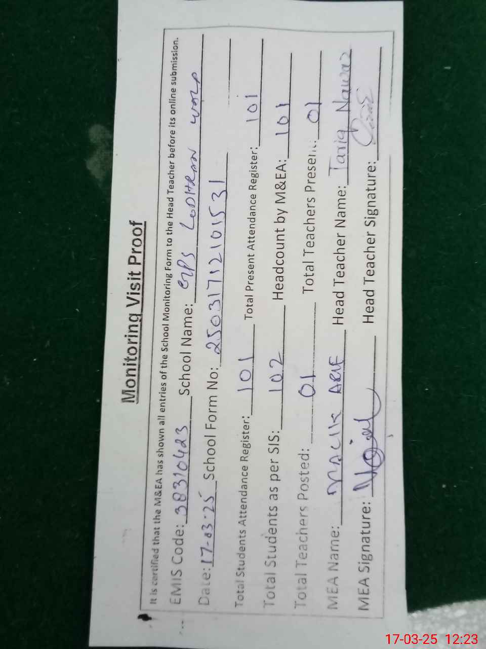 | Attendance Register | Head Teacher | MEA with School | Visit Proof |
