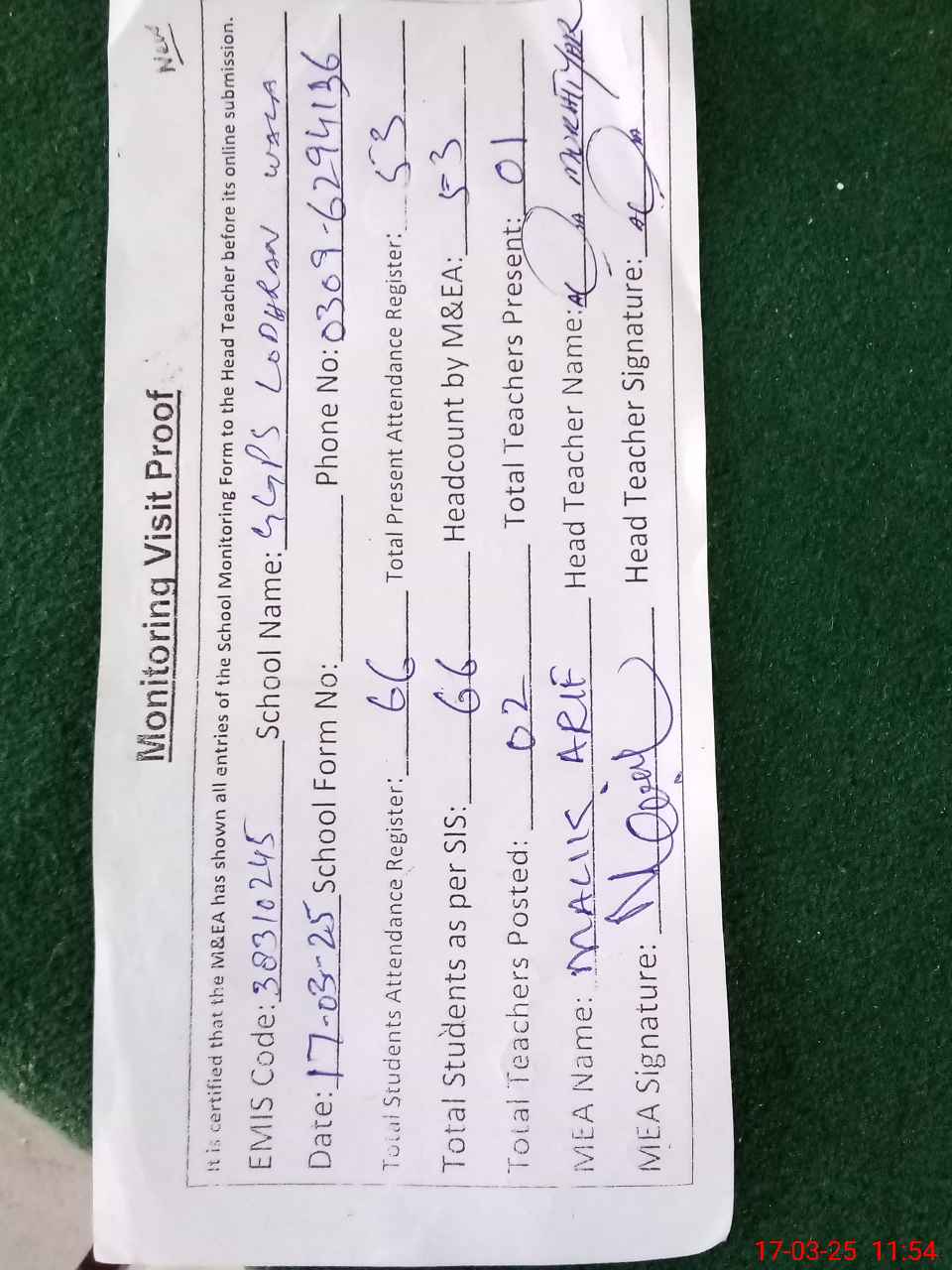 | Attendance Register | Head Teacher | MEA with School | Visit Proof |