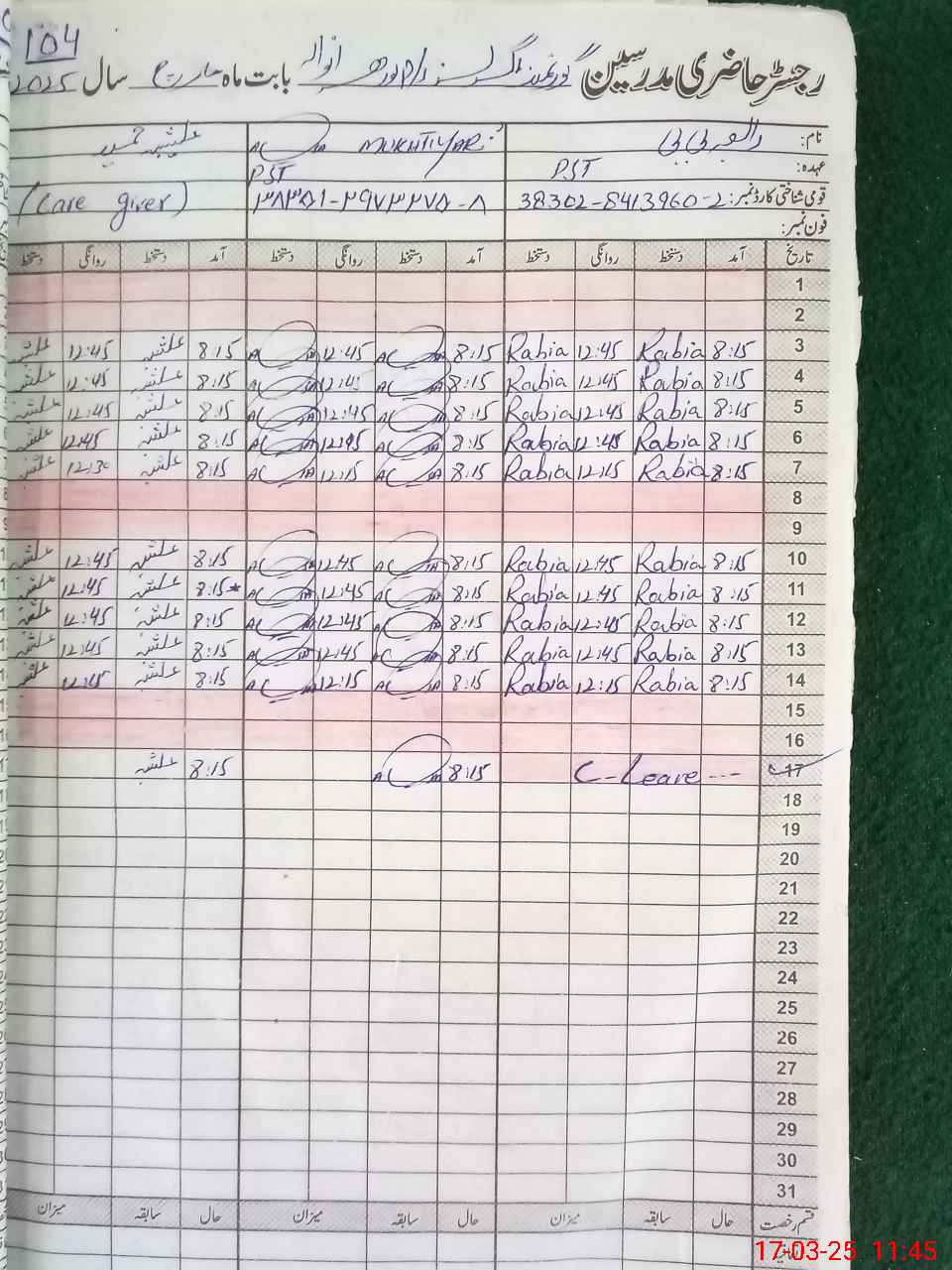 | CNIC | Full Name | Designation | R/C | Absence During Last Calender Month |