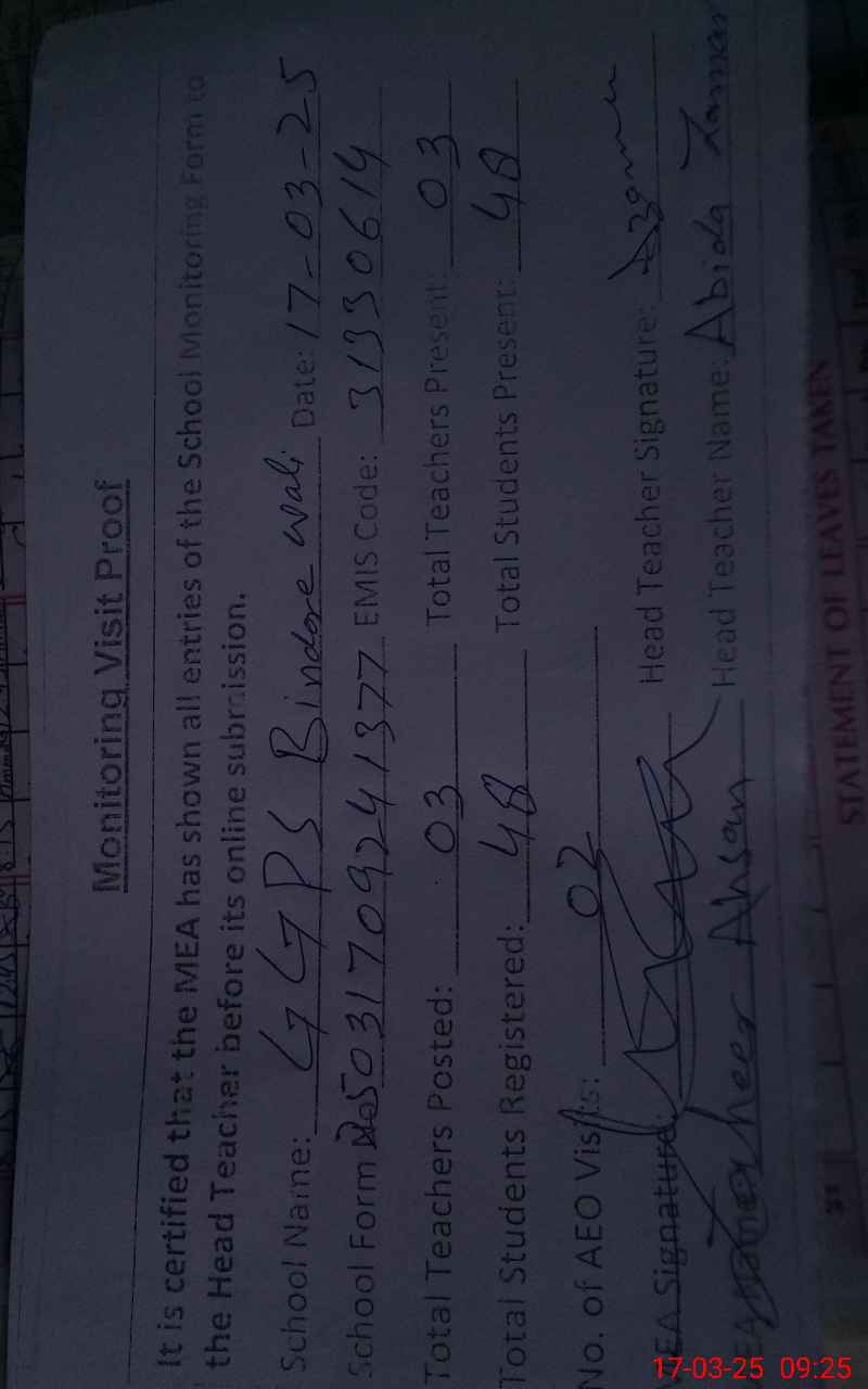 | EMIS Code: 31330614 | Name of School: GGPS BASTI BINDOOR WALI | |||