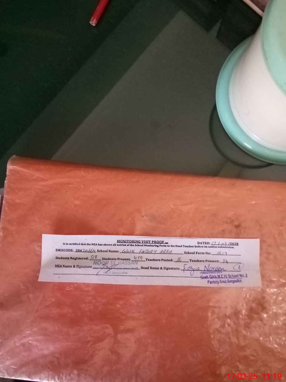 | Attendance Register | Head Teacher | MEA with School | Visit Proof |