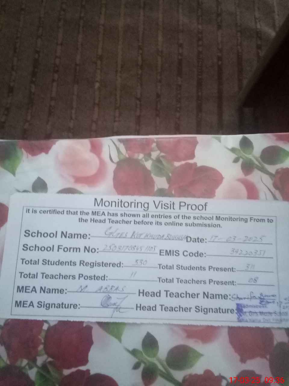 | Attendance Register | Head Teacher | MEA with School | Visit Proof |