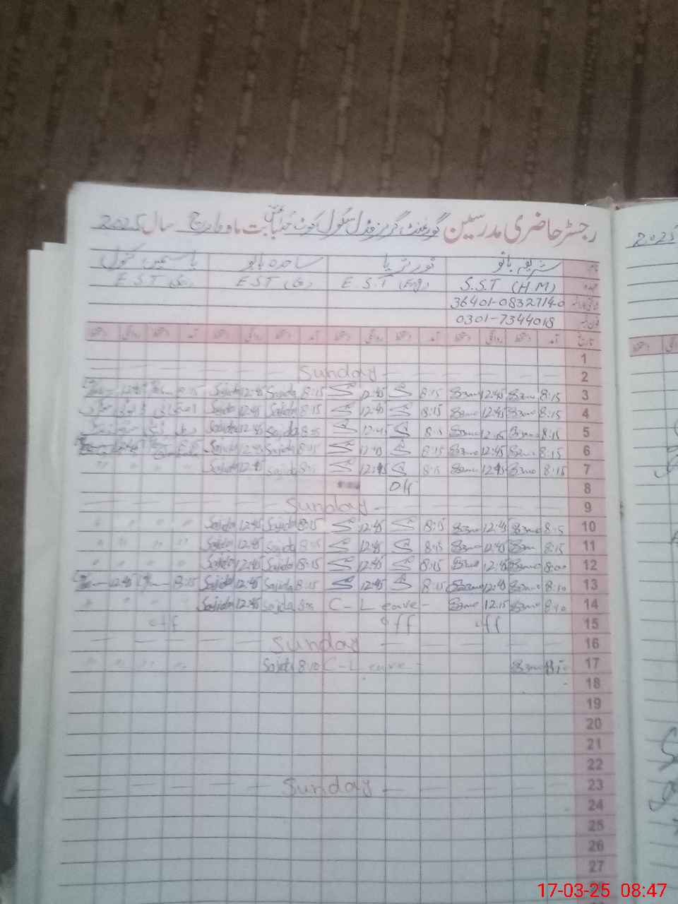 | Name: SH**** BA**** Designation: (School Headmaster's/Headmistress's) S.S.T.(GENERAL) Phone/Cell Number: 03**** |