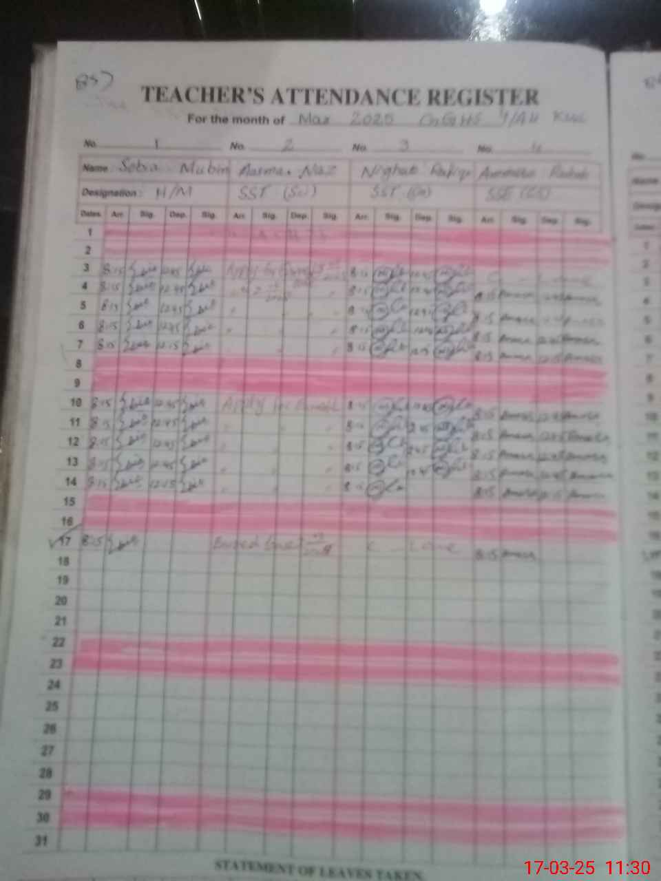 | No. of Students Present - Male | 12 | 0 | 21 | 32 | 25 | 36 | 25 | 24 | 0 | 0 | 0 | 0 | 0 | 175 | ||