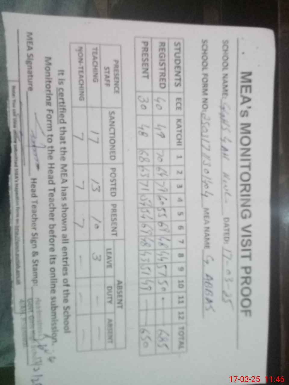 | Attendance Register | Head Teacher | MEA with School | Visit Proof |