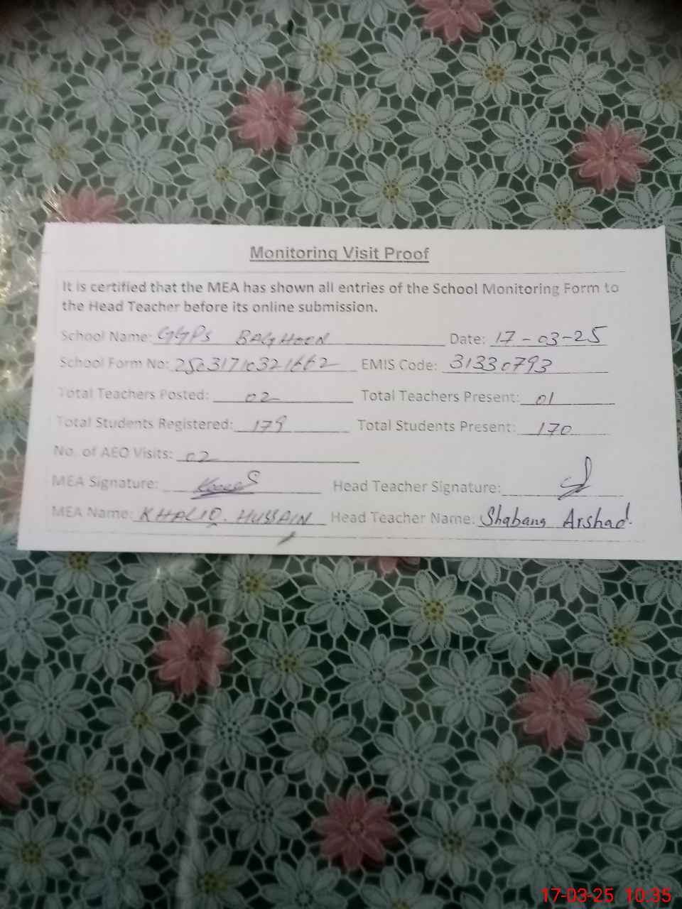 | Attendance Register | Head Teacher | MEA with School | Visit Proof |