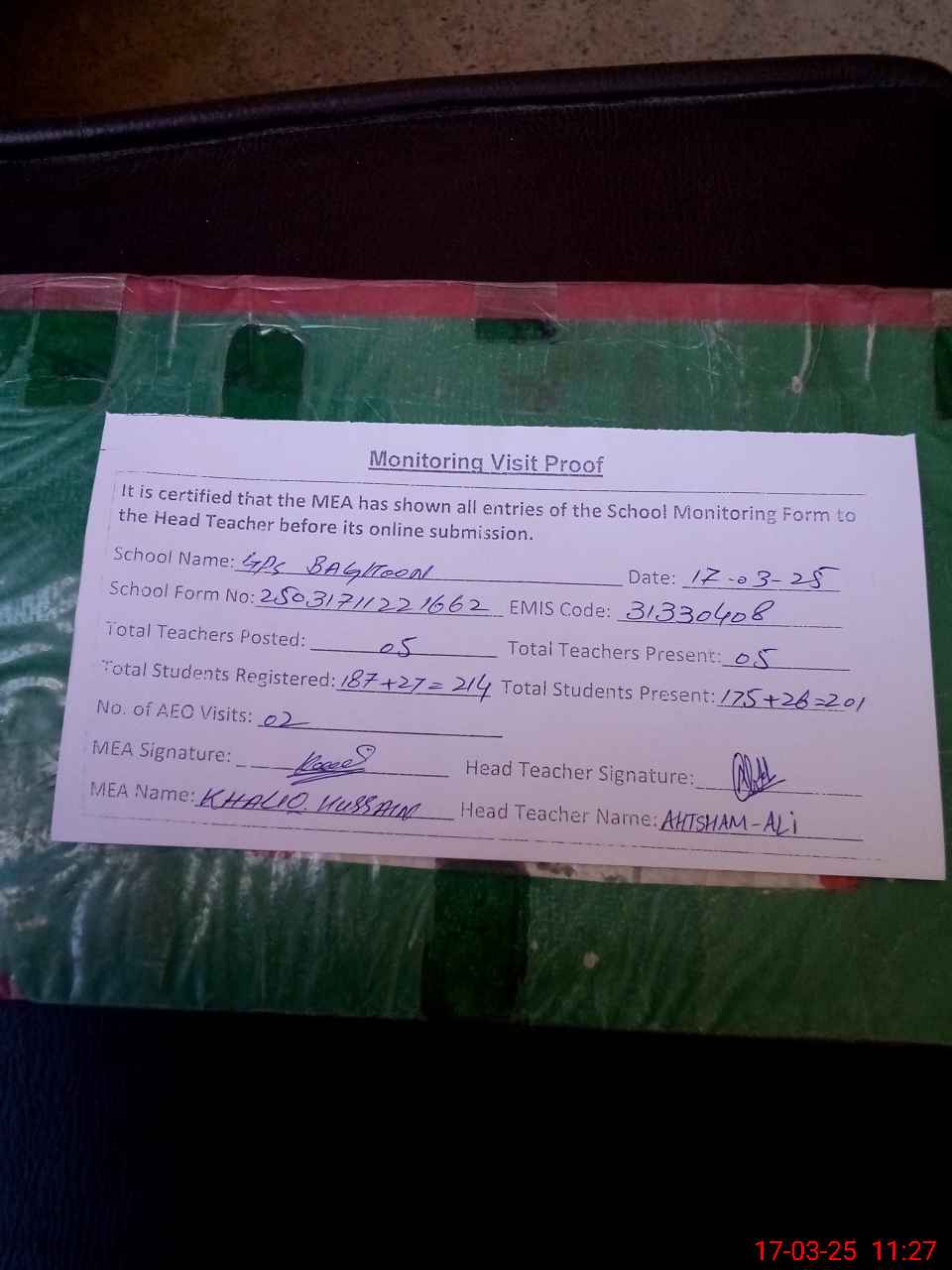 | Attendance Register | Head Teacher | MEA with School | Visit Proof |