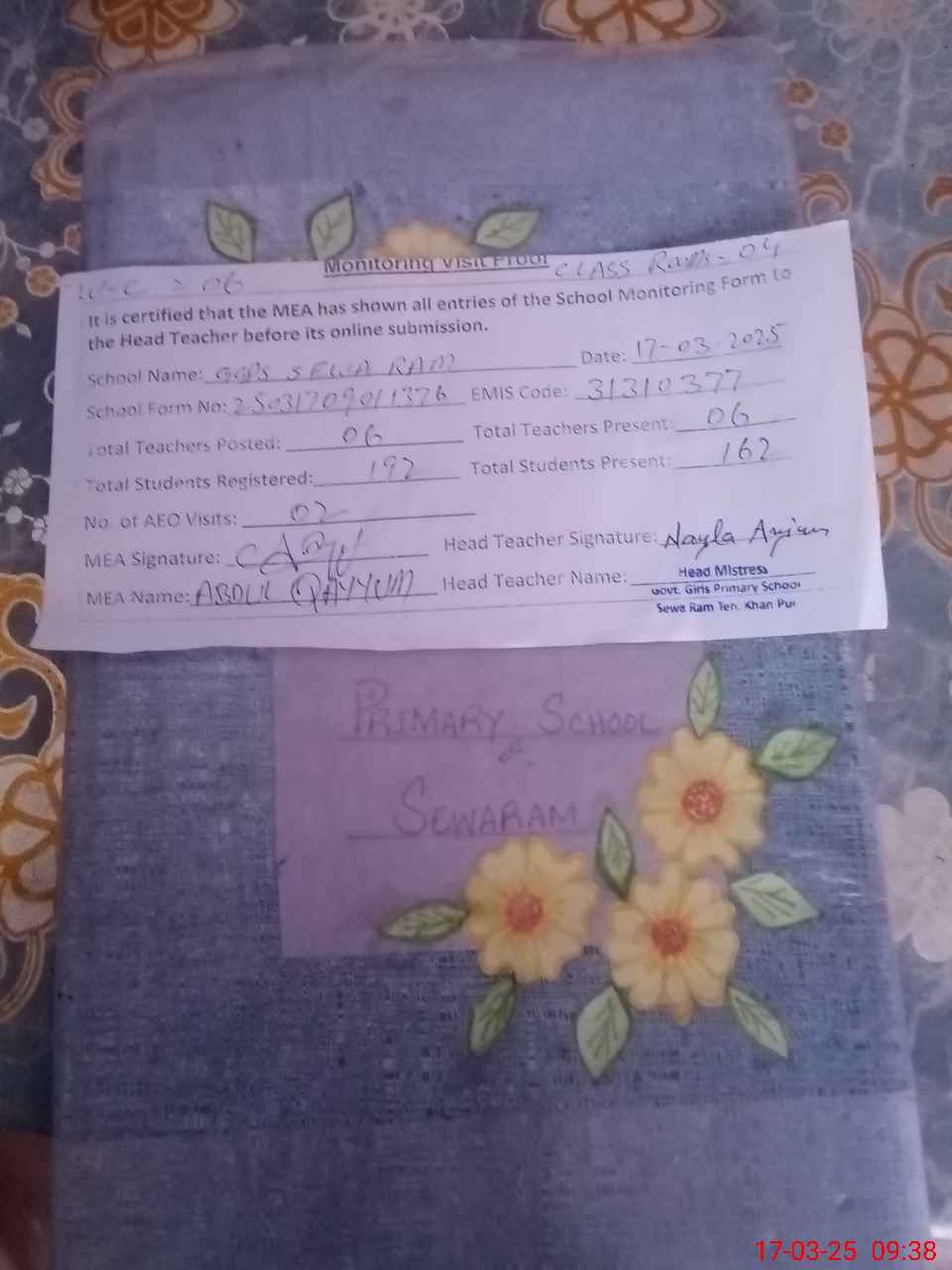 | EMIS Code: 31310377 | Name of School: GGPS SEWA RAM (After Noon) | |||