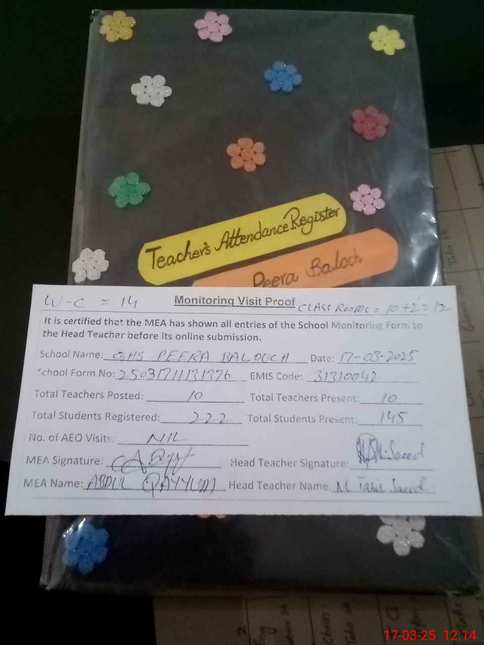 | Attendance Register | Head Teacher | MEA with School | Visit Proof |