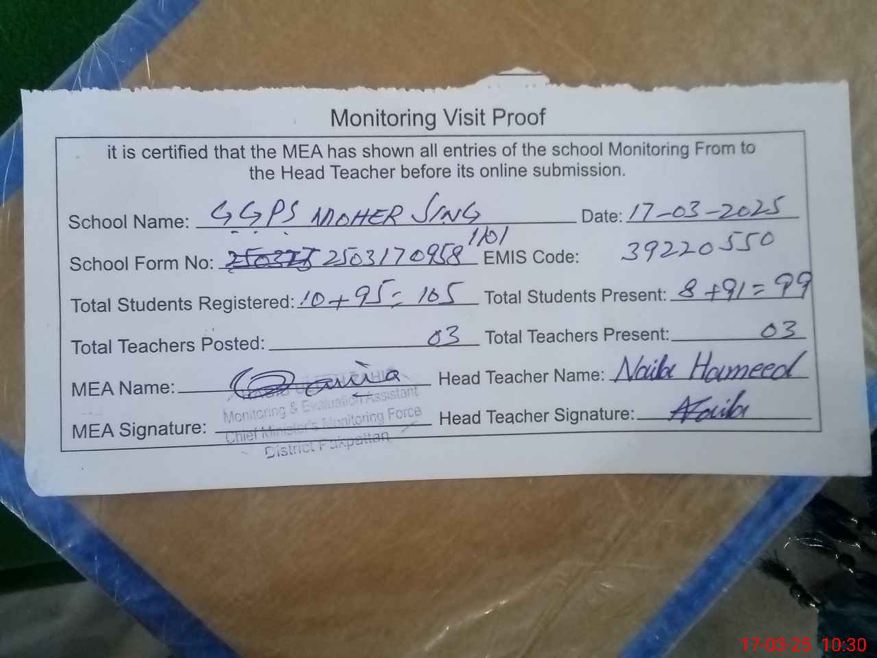 | EMIS Code: 39220550 | Name of School: GGPS MOHAR SINGH | |||