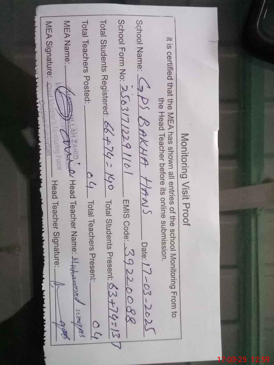 | EMIS Code: 39220088 | Name of School: GPS BAKHA HANS | |||