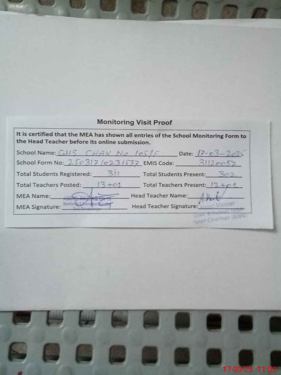 | Attendance Register | Head Teacher | MEA with School | Visit Proof |
