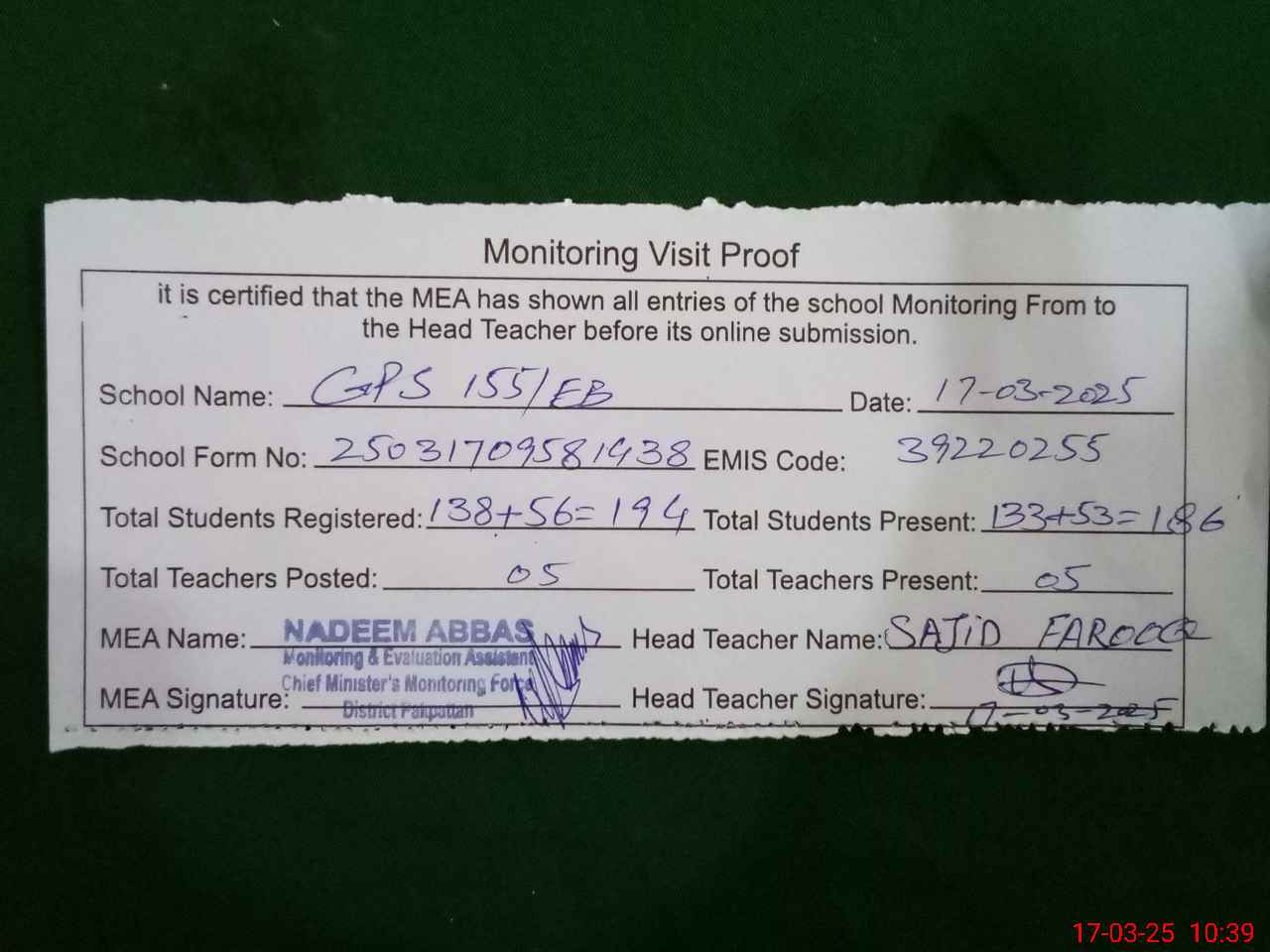 | EMIS Code: 39220255 | Name of School: GPS 155 EB | |||