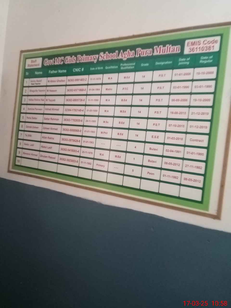 | EMIS Code: 36110381 | Name of School: GGPS MC AGHA PURA | |||