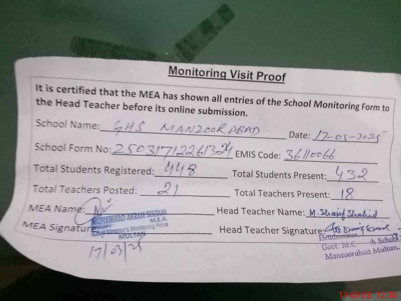 | EMIS Code: 36110066 | Name of School: GHS MC MANZOOR ABAD MULTAN | |||