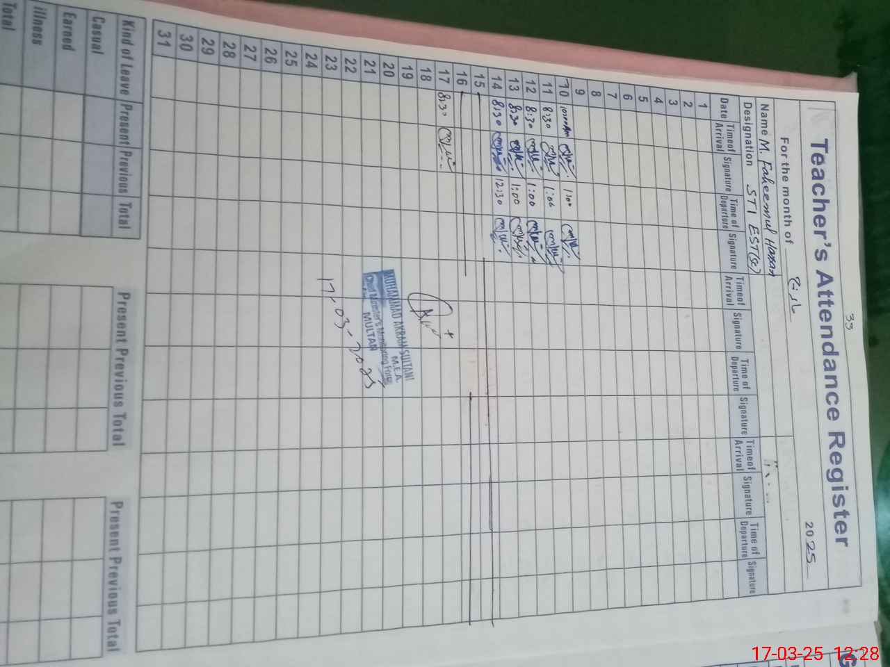 | 32**** | Sy**** Fa**** Hu**** Bu**** | EST | Regular | 0 | 0 | 0 | 0 | 0 | 0 | 0 | 0 | 0 | Exam Duty |