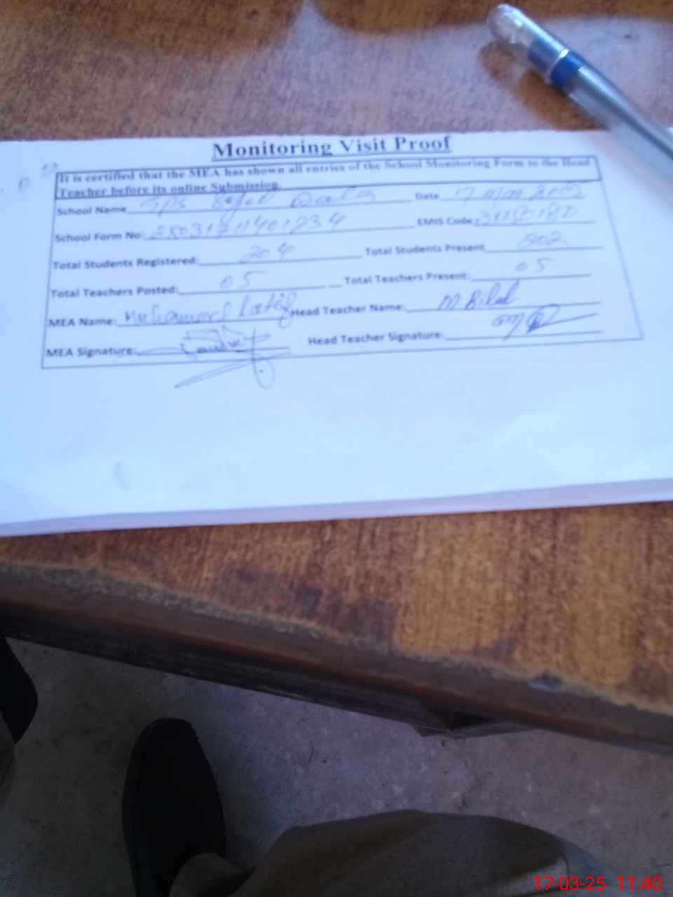 | Attendance Register | Head Teacher | MEA with School | Visit Proof |