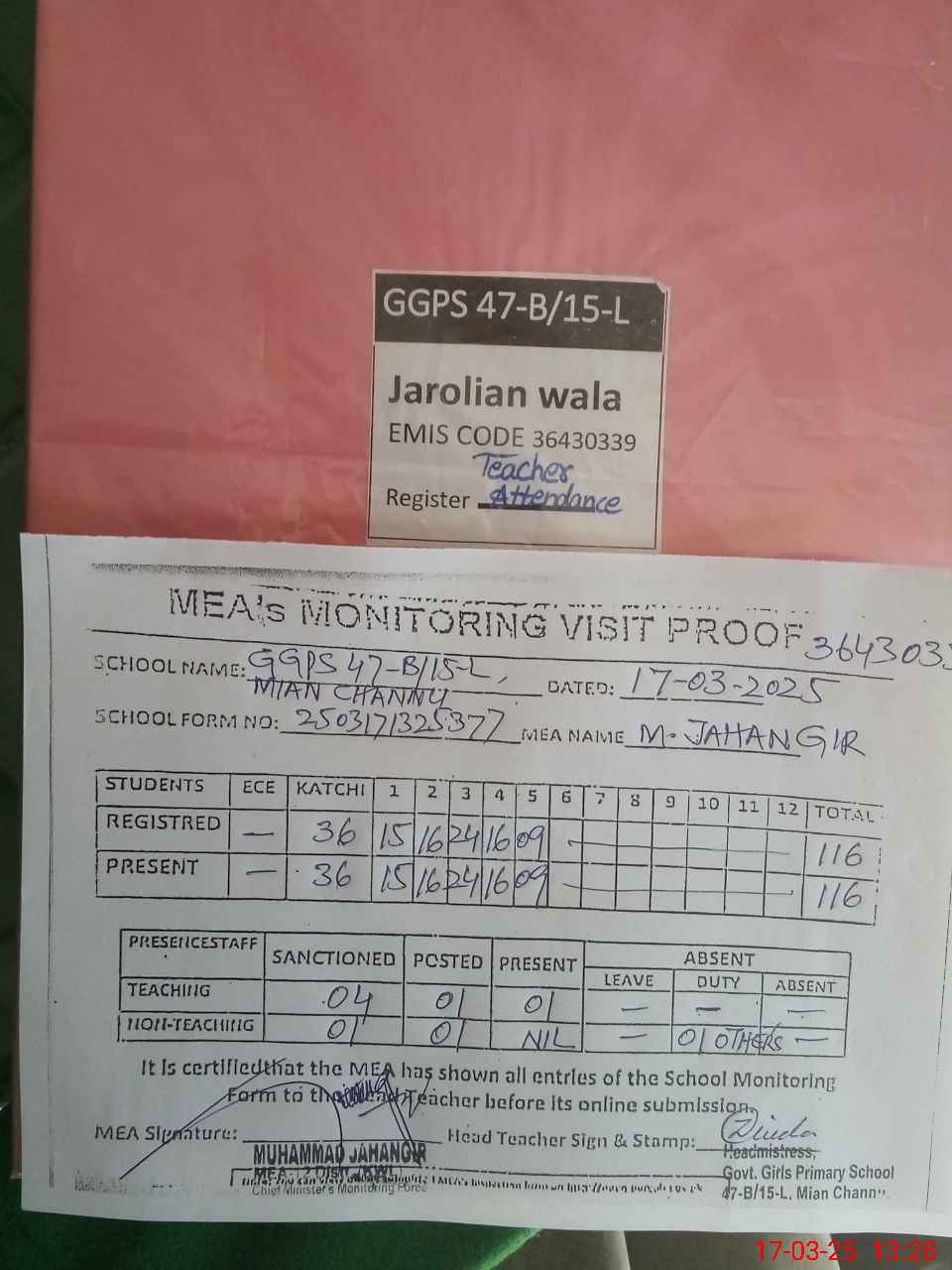 | EMIS Code: 36430339 | Name of School: GGPS 47-B/15-L, MIAN CHANNU | |||