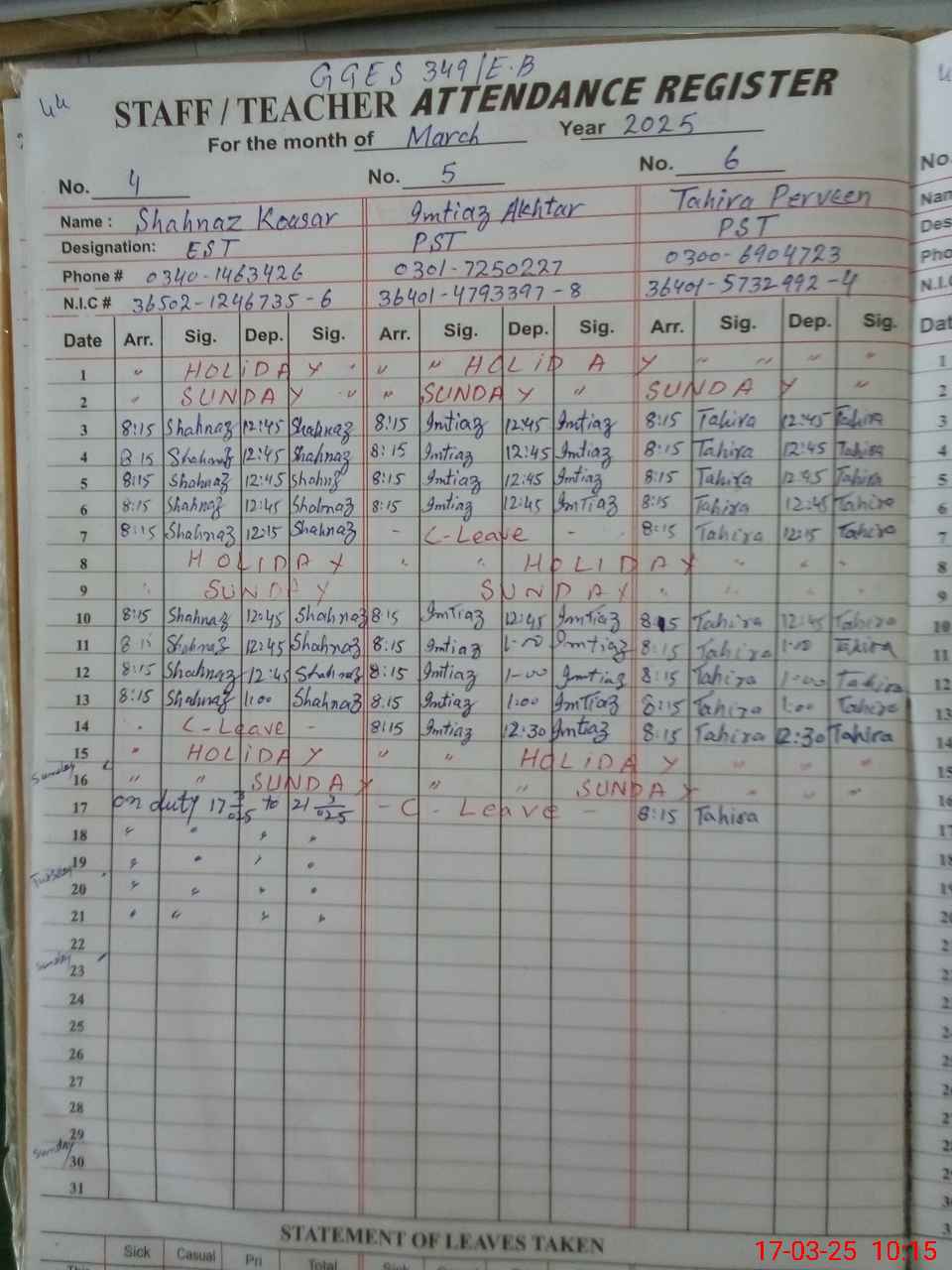 | CNIC | Full Name | Designation | R/C | Absence During Last Calender Month |