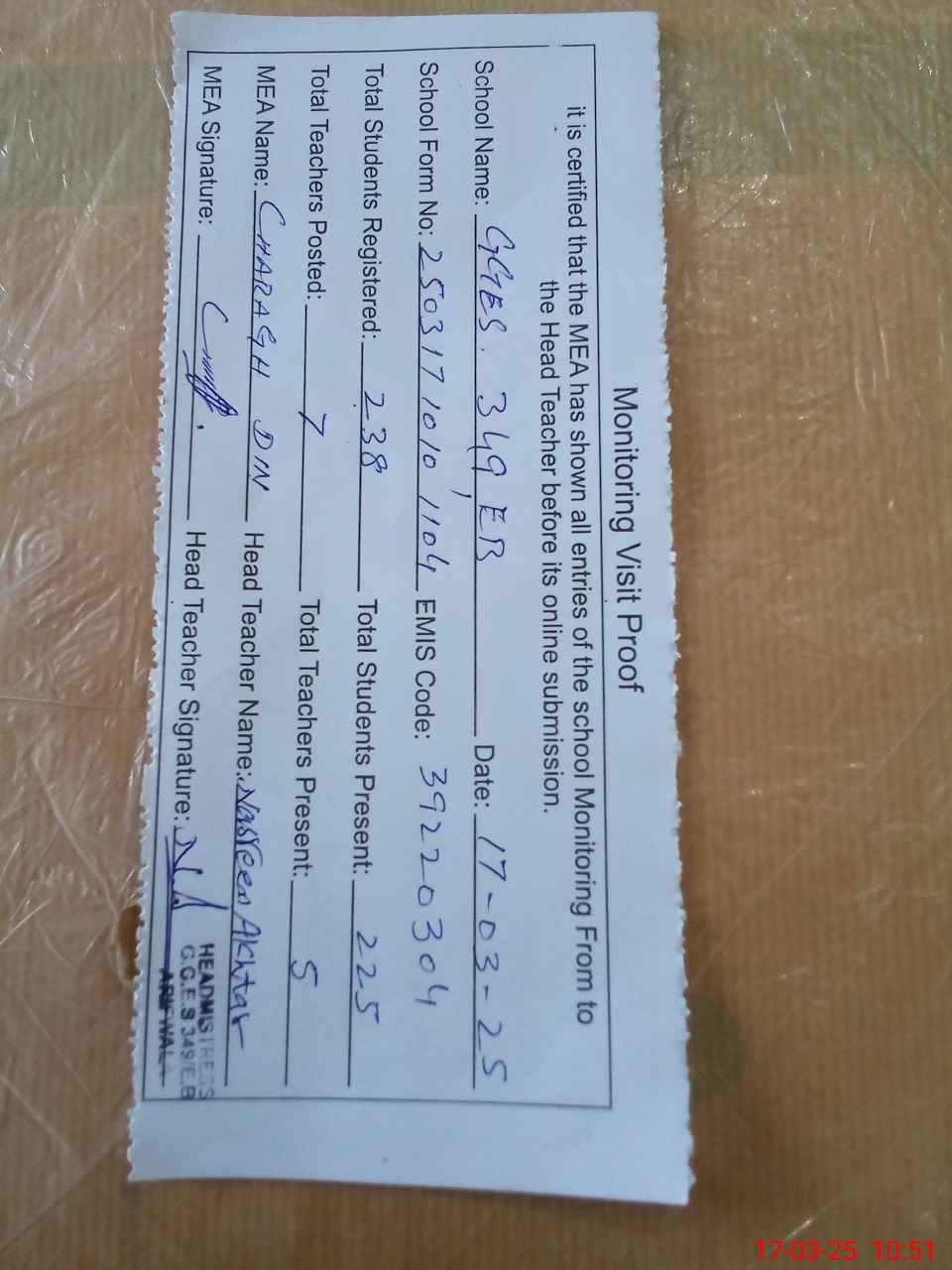 | Attendance Register | Head Teacher | MEA with School | Visit Proof |