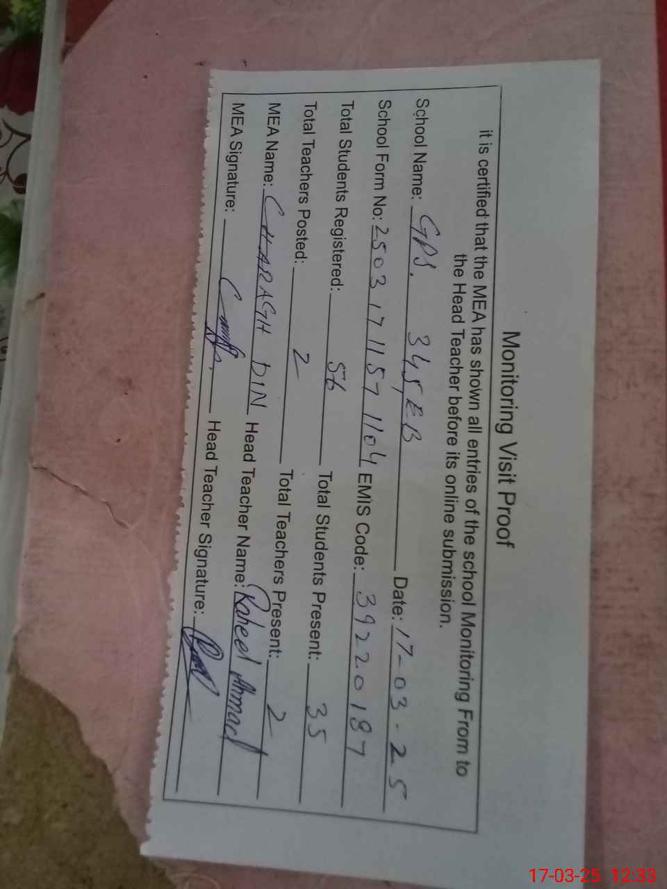 | Attendance Register | Head Teacher | MEA with School | Visit Proof |
