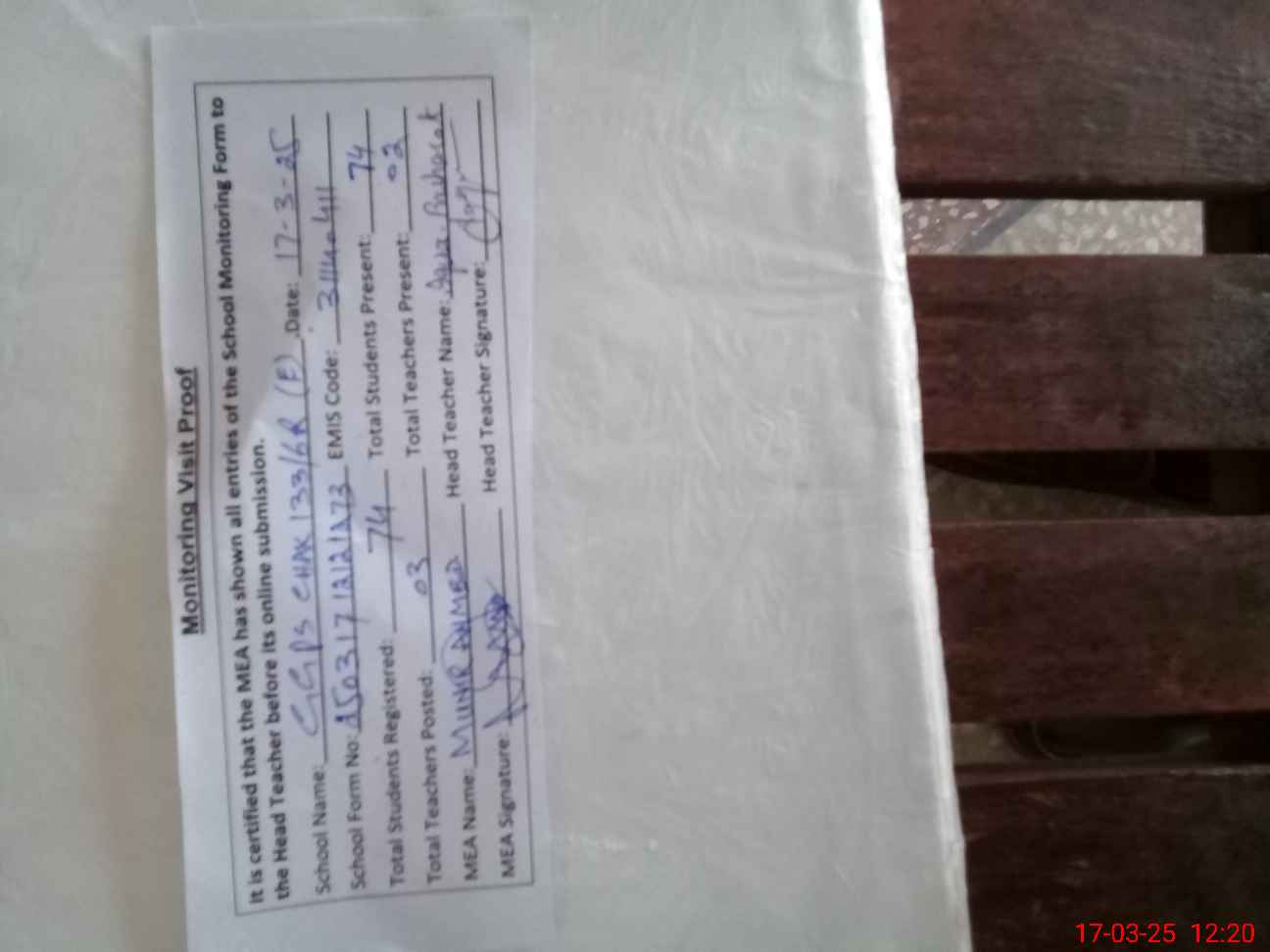 | Attendance Register | Head Teacher | MEA with School | Visit Proof |