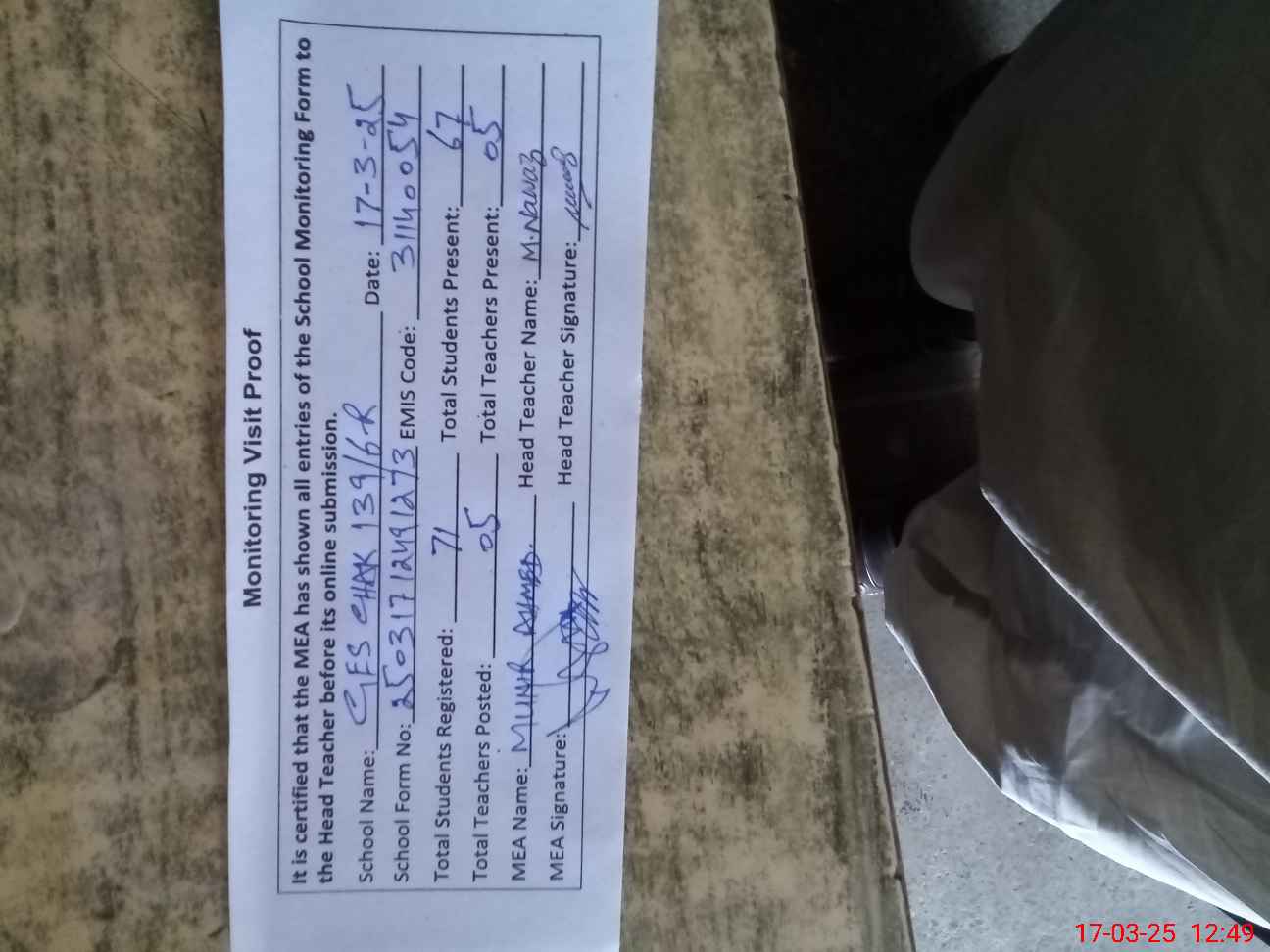 | Attendance Register | Head Teacher | MEA with School | Visit Proof |