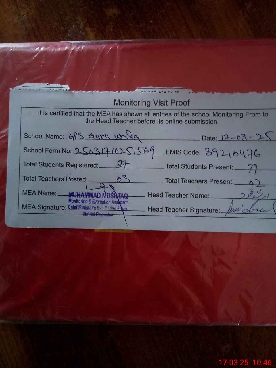 | Attendance Register | Head Teacher | MEA with School | Visit Proof |