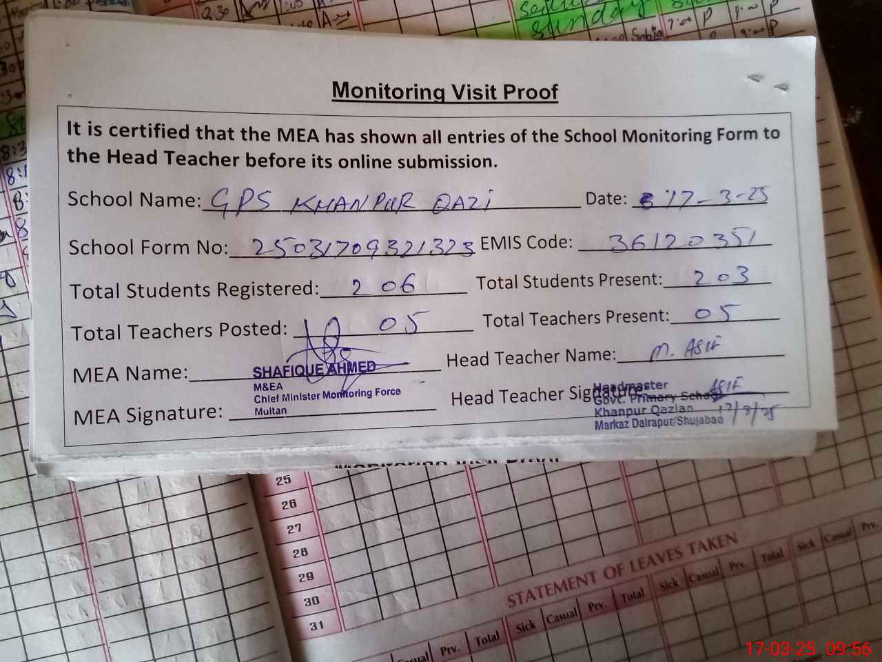 | Attendance Register | Head Teacher | MEA with School | Visit Proof |