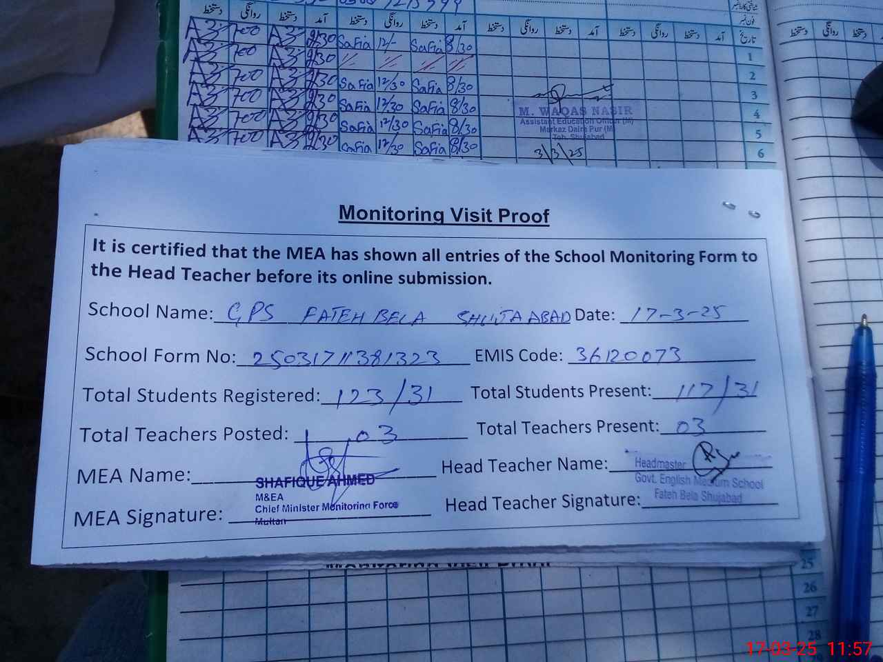 | Attendance Register | Head Teacher | MEA with School | Visit Proof |