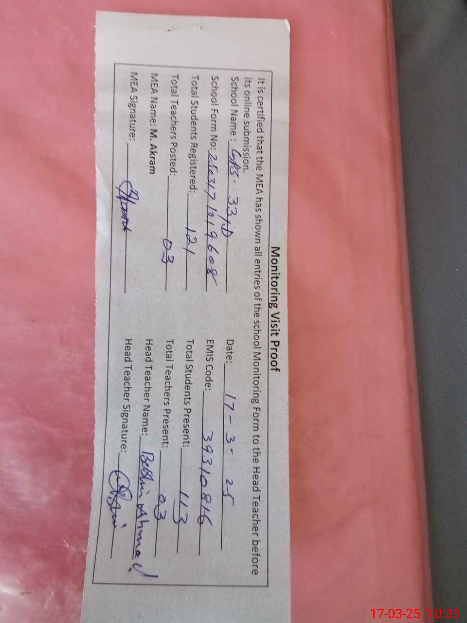 | EMIS Code: 39310816 | Name of School: GPS CHAK NO. 33-D | |||