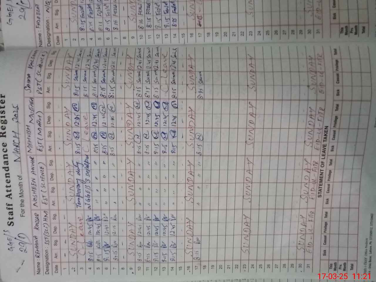 | CNIC | Full Name | Designation | R/C | Absence During Last Calender Month |