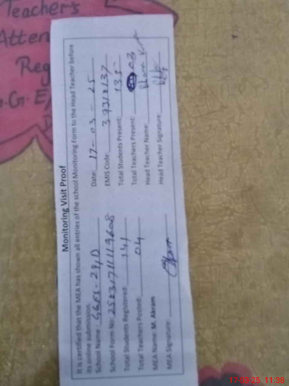 | Attendance Register | Head Teacher | MEA with School | Visit Proof |
