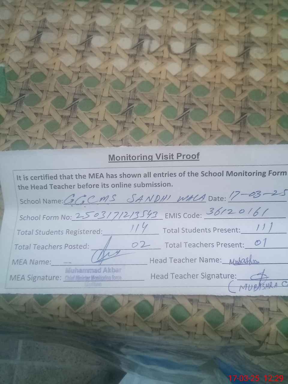 | Attendance Register | Head Teacher | MEA with School | Visit Proof |