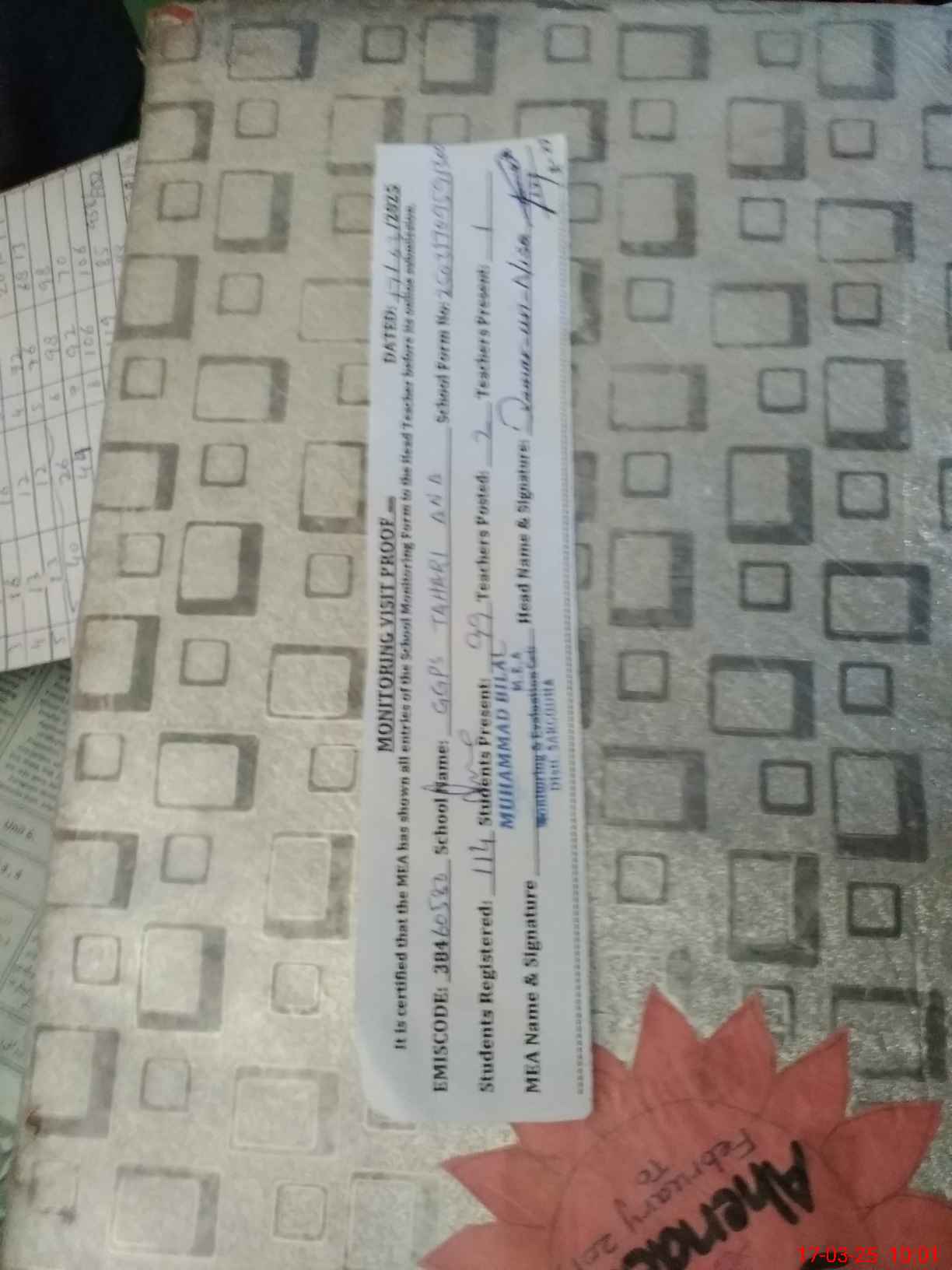 | Certified that this School was Inspected by the Undersigned MEA/DMO Today and the Information Stated Above is as Per Record. | |||||