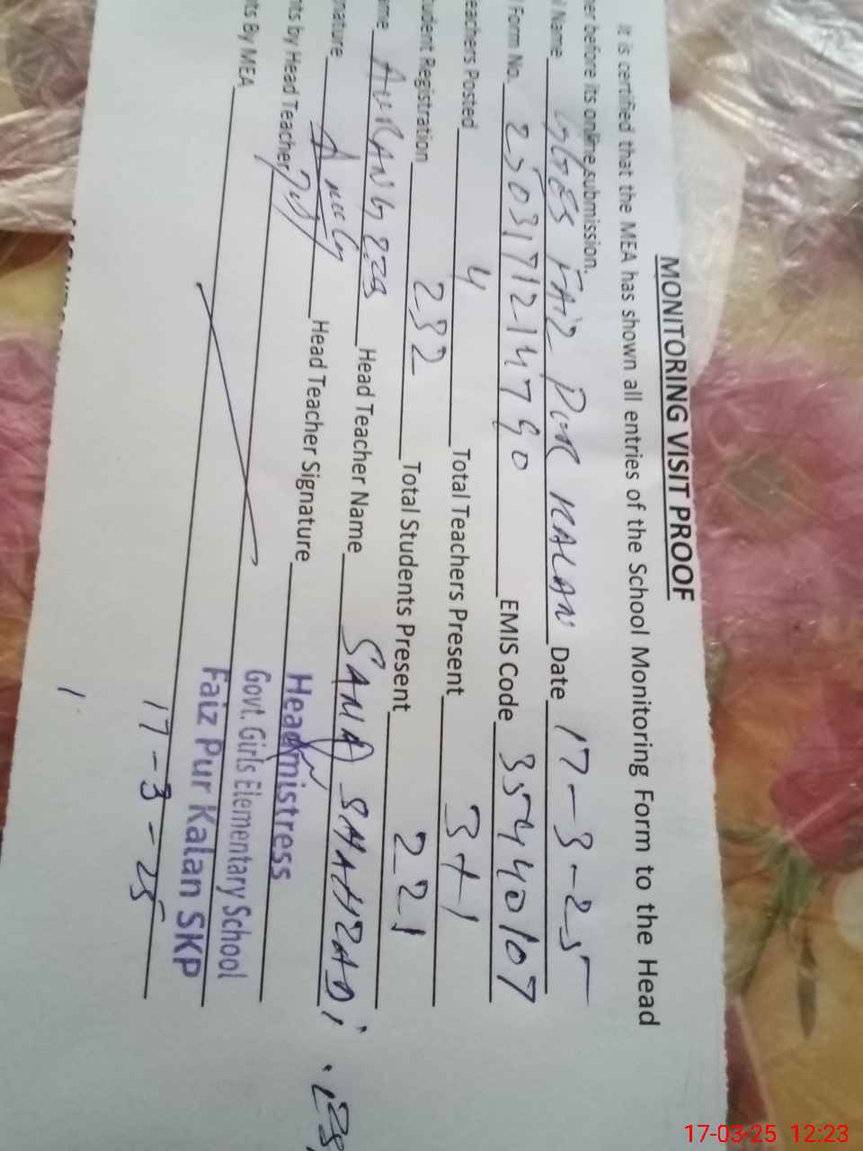 | Attendance Register | Head Teacher | MEA with School | Visit Proof |