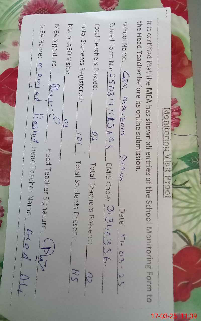 | EMIS Code: 31340356 | Name of School: GPS MANZOOR ARAIN | |||