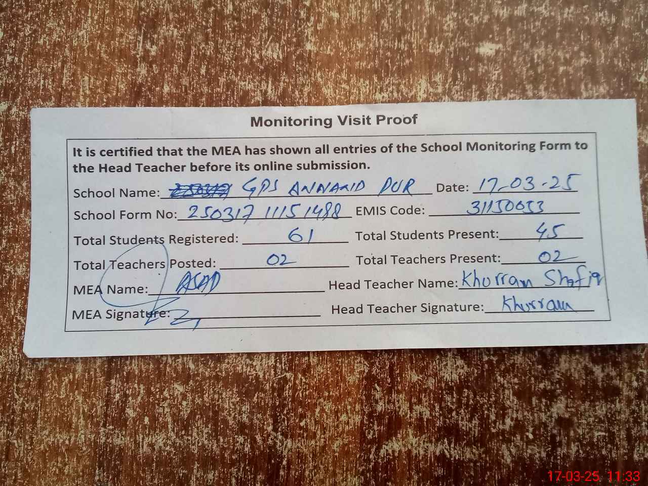 | Attendance Register | Head Teacher | MEA with School | Visit Proof |