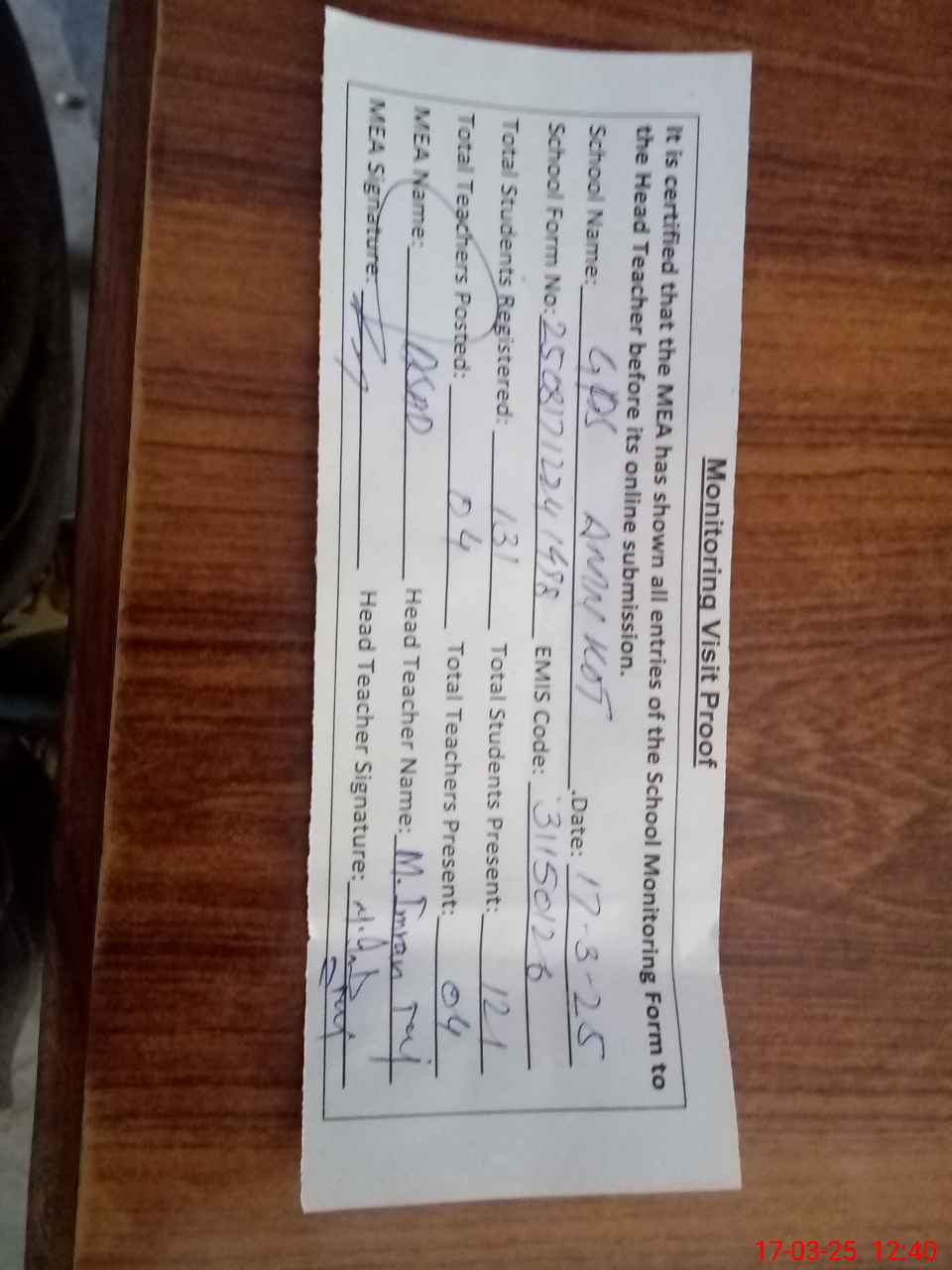 | Attendance Register | Head Teacher | MEA with School | Visit Proof |